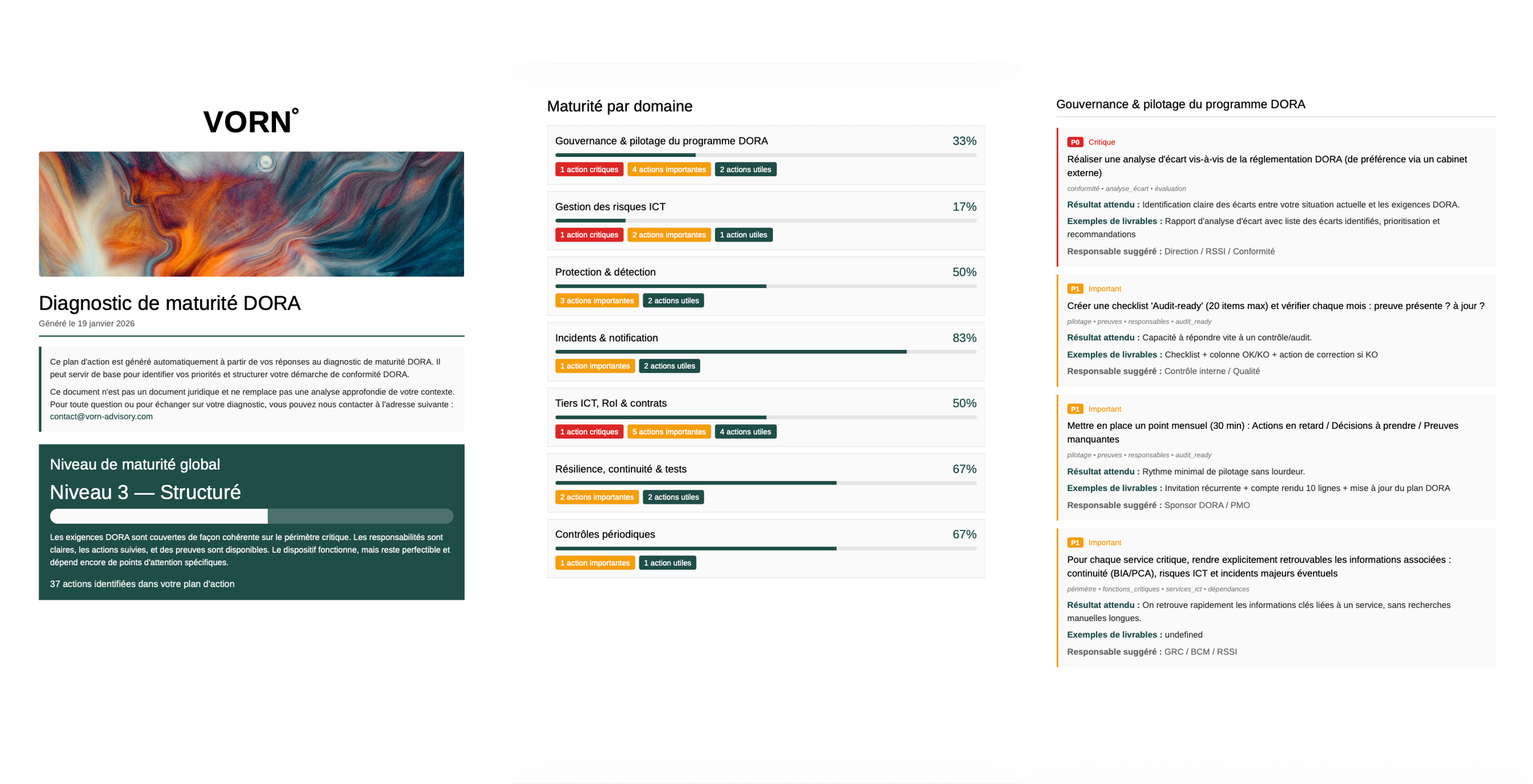 VORN° réalise une évaluation complète de conformité DORA, combinant une lecture juridique et opérationnelle des exigences.